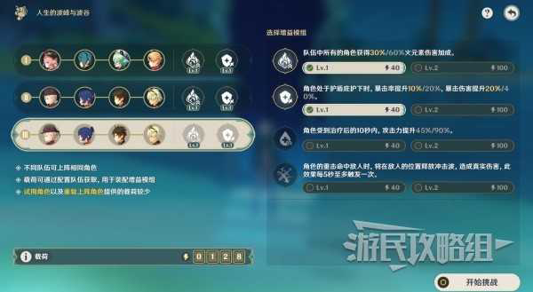 搭配要点为尽量选择火系输出或重击输出角色来充分利用增益模组,然后加入盾系或治疗角色保证生存。例如【胡行钟】、【那维莱特+钟离】、【林尼+班尼特】这样比较强力的组合。