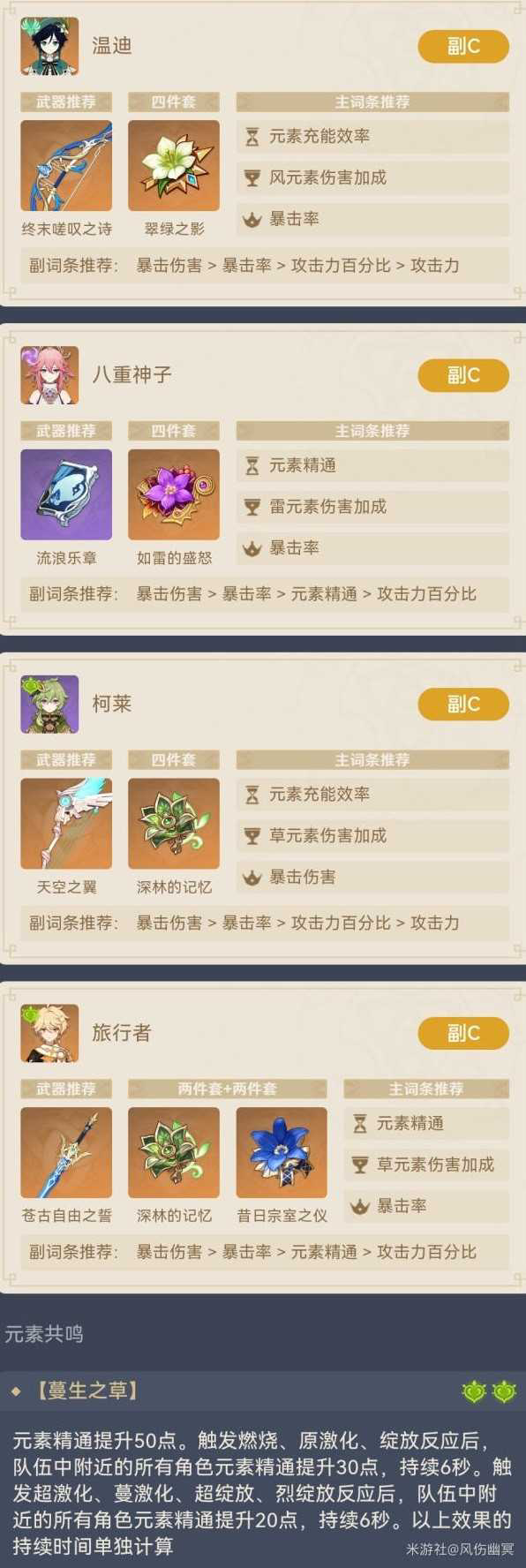 《原神》中草系是3.0版本新加入的属性,温迪在搭配草系角色的时候有什么好的队友可以选择呢,下面请看“风伤幽冥”带来的《原神》温迪蔓激化流配队参考,希望能够帮助大家。