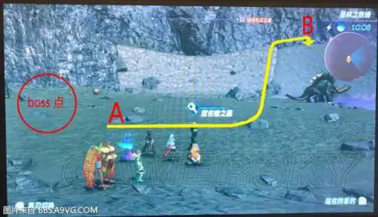 先看下图,清掉周围2只95级的小怪,从A地点引BOSS,沿着黄线往坡上跑,到B地点回头看下BOSS,然后在B地点左右走动下,确保BOSS能走到石头后面去。