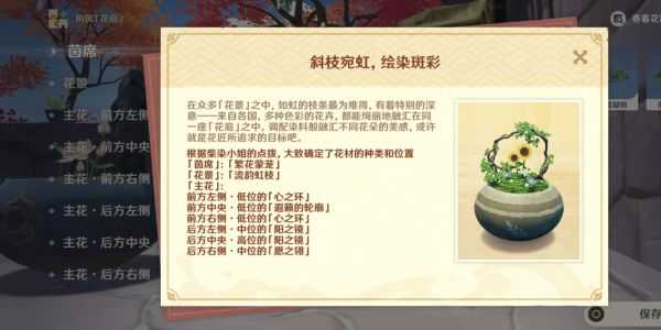 今天的「花题」是斜枝宛虹,绘染斑彩,听起来同样富有诗意呢。上图是游戏里的提示,我们可以参考它来装饰花盆,但是文字叙述有点多,下面我们来具体说说: