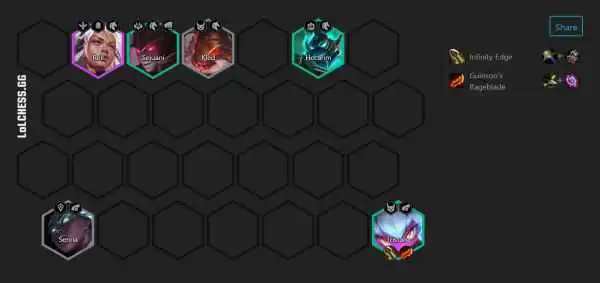 亡魂六刺跟黑夜游侠一样,在S5.5美测服中七进七出,杀得一众阵容苦不堪言,主要是新版本的亡魂六刺得到了新加强。因为新版本增加了一个稻草人,而稻草人是属于亡魂羁绊的,也就是说我们现在在没有亡魂转职的情况下,最少也有4亡魂羁绊。4亡魂能够复活并且恢复60%血量,相当于一件小黑暗复活甲还是不错的。