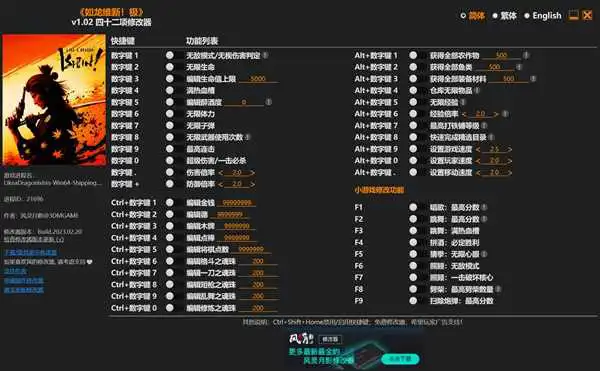 简体、繁体、English,可以切换语言 (切换语言后修改器将把该语言设置为默认语言)。