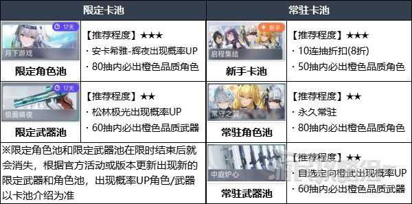 《尘白禁区》公测开启后总共有五个卡池,其中3个为常驻池,2个为限定池。下面就为大家介绍一下《尘白禁区》卡池概率及保底规则,希望对大家有所帮助。