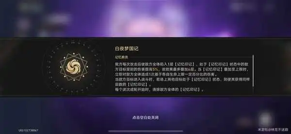 buff介绍:我方每次攻击后使敌方全体陷入1层【记忆印记】,每层【记忆印记】使敌方目标受到的伤害提高5%,最多叠加6层(受到的伤害提高30%)。当【记忆印记】叠满6层后立即对敌方全体造成各自生命上限百分比伤害,进入新伦次后重新计算层数。