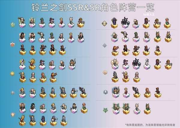 领袖光环可以提升在场所有同阵营角色的面板属性、并提供不同阵营的额外增益效果。SSR&SR全角色阵营以及阵营光环持有者如下: