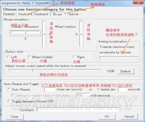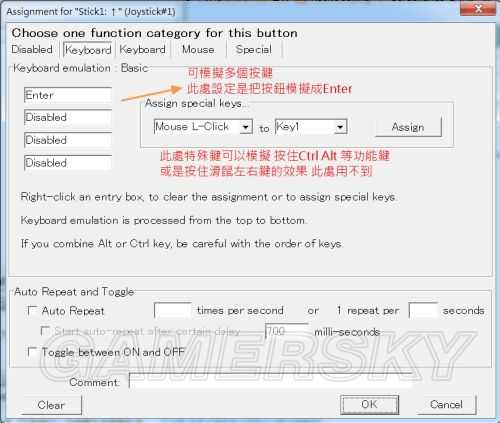 如上图就是模拟成Enter 因为轩六控制并不复杂所以多组按键自动连发或是复合键都用不到~ 而第二页的keyboard 那是设定类似巨集的功能有兴趣的人就自己玩吧