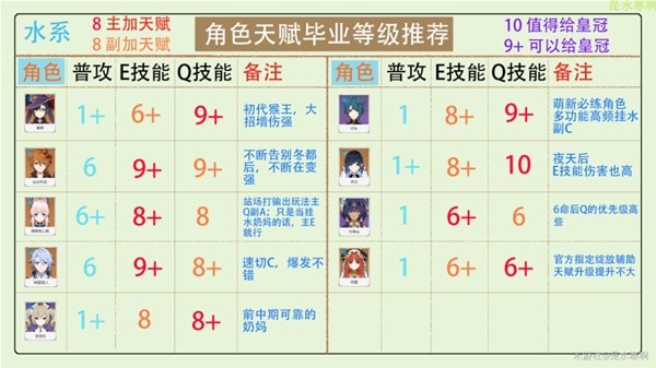 作为副C的莫娜,常驻之光,10级大招有着高达60%的增伤能力,可以给皇冠。行秋则是很多玩家都恨不得能拆成多个来用的“稀有角色”,大招倍率高,也是可以给皇冠的。不过夜兰即将上线,不知道可否撼动行秋的地位。神里绫人,作为水系主C,表现也还可以。夜兰虽无法做不了行秋的上位,但高额的增伤能力与不俗的伤害能力依然让她保持着不错的出场率,大招也是可以给皇冠的。妮露的定位则是偏向于绽放辅助和提供挂水,天赋升级的收益并不高。