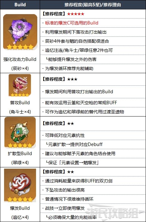 4件套:施放元素爆发后,将产生持续16秒的「潜光」效果:攻击力+8%;并在角色的生命值降低时,攻击力进一步提升10%。此效果最多提升4次,每0.8秒最多触发一次。「潜光」效果将在角色退场/无法战斗时解除;持续期间再次施放元素爆发,将移除原有的「潜光」效果 - 简易评价:强化攻击力Build是最标准和推荐的Build,通过在元素期间发动下坠攻击产生输出,不用考虑阵容和与其它角色的搭配。为确保元素伤害Buff,需要在注重攻击力和确保最低元素充能效率的情况下才能运用