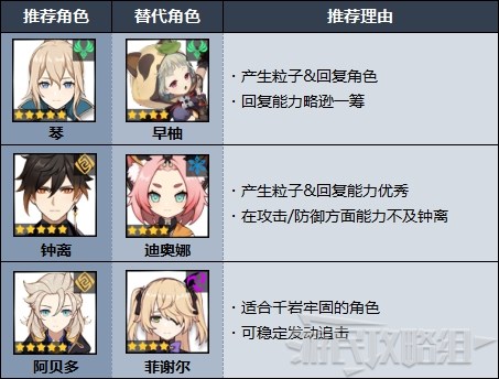 采用兼具风共鸣/回复能力的琴提升稳定性,在相互辅助充能的同时进行反复攻击→交替回复。岩共鸣在攻防两方面都很优秀,钟离和阿贝多能够根据圣遗物增强魈的输出能力,是全员搭配都比较适合的理想阵容。