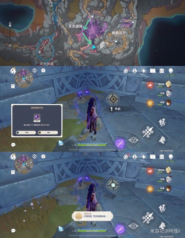 收集齐渊青宝珠*9之后,回到如图点位传送点,要从天空建筑一直走到最终目的地,使用渊青宝珠后“开启”即可获得成就「CREDE TENEBRAE」