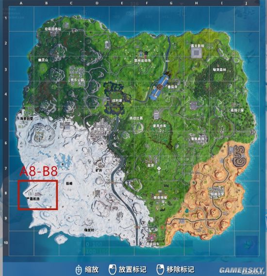 严霜机场位于地图的A8-B8,属于接近整个地图的右下角位置。