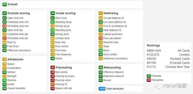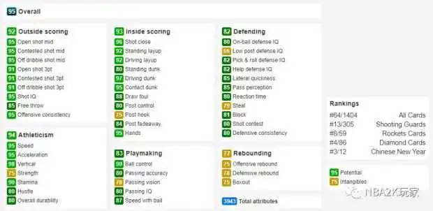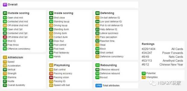其实这张约什才是这波卡里属性总值最高的,高达4018,投射能力还算可以,中投三项在85左右,空位三分84。毕竟是鹰王,内线进攻能力非常强,近距离,上篮,扣篮和背身应有尽有。这张卡最为出色的地方是他的防守能力,几乎所有小项都给到了95!运动能力优秀,除了5号位之外,能从1防到4。