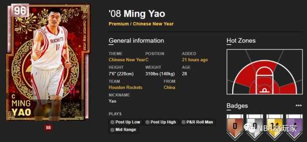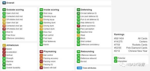 还是我们大土姚看起来最亲切啊!这张粉姚的属性总值为3598。进攻端内外线能力都不错,95的空位中投和92的受干扰中投,70的三分!感谢2K的开发,有三分的长城,可不可怕?!内线进攻方面非常全面,仅运球上篮扣篮和隔扣在90以下,背身能力非常强,背控给到了97。防守端除了27的横移之外,其余属性给的都非常到位,甚至还有70的抢断,94的力量过关。228的东方巨人,这张姚明除了机动性之外,非常全面。其他的就不多说了,中国篮球永远的旗帜,小编的首发C。
