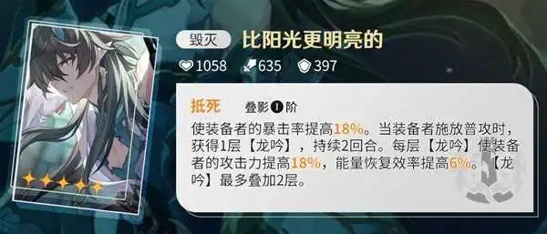 而且专武也提供了攻击属性,攻击加成照样不逊色与其它毁灭光锥;充能属性虽然在有停云时效果并不明显,但数值有了就是有了,总有起作用的时候。