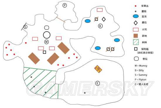 中间祭场是出生点,有四个火坑用于烹饪,三块耕地用于种植。