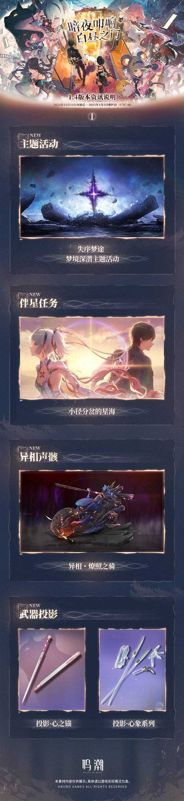 正文 2025年《鸣潮》1.4版本更新前瞻 1.4版本新增内容一览「别错过」 游戏小天使 /2025-02-20 17:58:28 /39 浏览量 0220 《鸣潮》将在11月14日更新1.4版本,想了解具体更新内容的小伙伴请看下方由官方为大家带来的《鸣潮》1.4版本更新前瞻,希望可以帮助到大家。 日长篱落无人过,惟有蜻蜓蛱蝶飞。 -- 展开阅读全文 --
