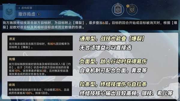 终结技命中敌方时,为其施加【爆裂】效果(至多6层)。在敌人行动或被消灭时触发爆裂,伤害目标及相邻单位。很明显,此BUFF利好群攻型角色,一次行动为多个目标施加【爆裂】效果。