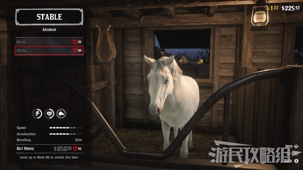 这是本作中综合属性最好的一匹马,售价850美元。它较高的生命值、耐力、出色的速度(加速)都证明了它的确物有所值。它是西部最敏捷最易驾驭的马匹,是你在树木丛生的茂密森林中骑行的理想选择。如果你玩的是PS4版,那你可以免费获得一匹红色阿拉伯马。