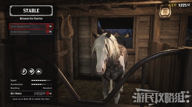 这是线上模式里最贵的一匹马,有2个毛色可以选购:银色花斑和琥珀香槟色。价格这么高当然是有道理的,这匹马的速度和耐力可以说无与伦比。不过你得先达到58级才能解锁这匹马。