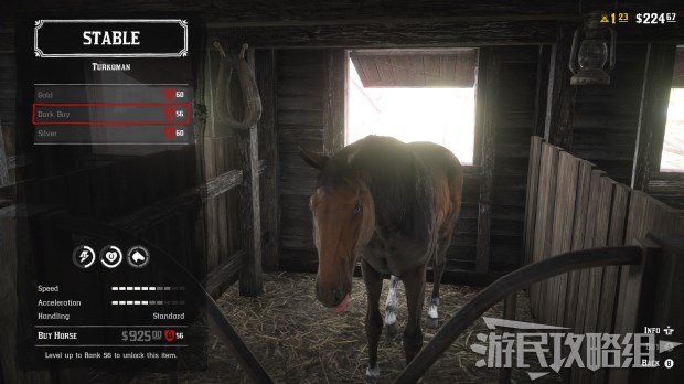 对于喜欢参加竞速活动的玩家来说,土库曼马是一个绝佳选择。虽然看起来瘦骨嶙峋,但是奔跑起来迅如疾风,而且生命和耐力也非常不错。深骝色土库曼马是最便宜的毛色版本,只要925美元就能买到,前提是你达到了56级。虽然它归类于“标准”,但实际上它是本作中最迅捷的马匹之一。