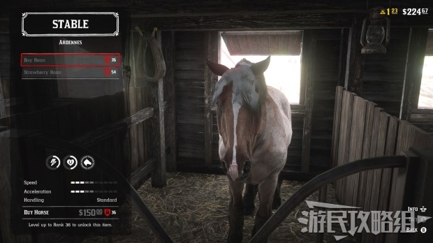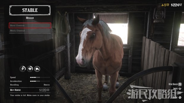 它的数据与其他马匹相比较确实很差,但是在游戏初期,这是你能买到的最可靠的马匹之一。比利时马是挽马中最快的品种,胜过夏尔马,同时还拥有不错的生命值和耐力值。如果你刚进入线上模式,不知道该买什么样的马匹时,那么可以考虑一下比利时马。