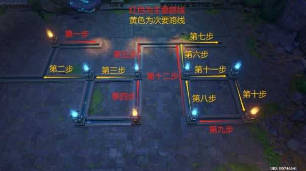 按照上图所示步骤推动机关,黄色指示为蓝柱机关的路线(次要路线),红色指示为金柱机关的路线(主要路线),以下是该解谜的视频地址: