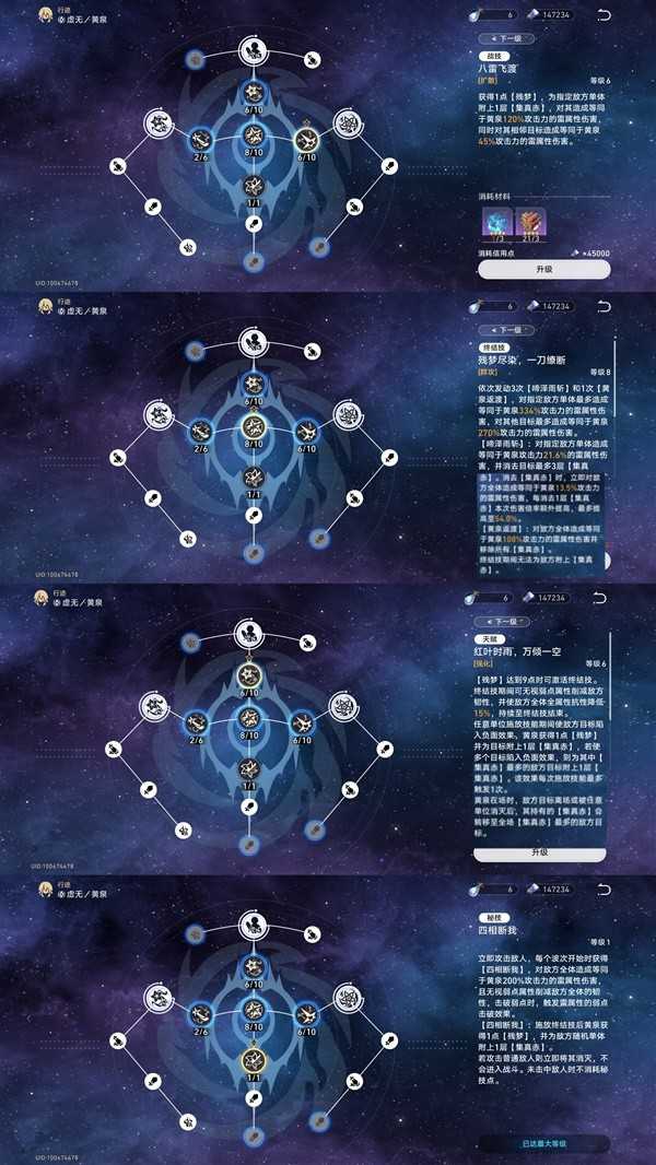 行迹加点方面,黄泉主要是依靠终结技打伤害,因此主要升级终结技,其次是战技,稍后面的是天赋,天赋看似说了一大堆,实际上升级内容就是无视全抗性的比例,还不如升级战技天赋就只能稍稍靠后了,最后是普攻,普攻甚至可以完全不升级。