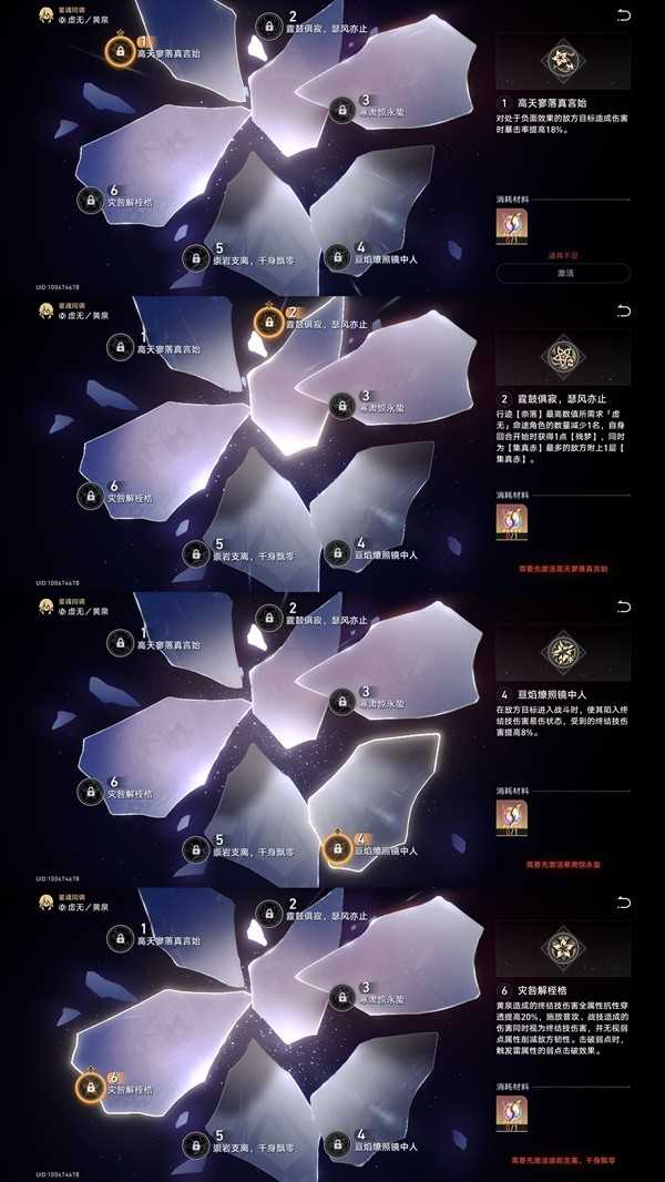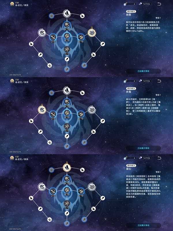 黄泉的每个关键行迹节点都是黄泉重要机制。【雷心】:黄泉终结技【啼泽雨斩】命中带有【集真赤】的目标时,获得30%增伤,最多三层,持续3回合。实战可以当做常驻90%的增伤,因为黄泉可以实现三动一大,同时【黄泉返渡】额外对随机敌方单体造成6段伤害,该伤害视为终结技伤害;【奈落】:我方存在1/2名【虚无】命途角色时,黄泉造成的伤害提高115%/160%,注意,黄泉自身不计算在内,也就是说黄泉要另外带上两个虚无角色才能吃满增伤!【赤鬼】:进入战斗黄泉立即获得五层【残梦】,对随机一位敌方附加五层【集真赤】,【残梦】处于上限时,每溢出一层,获得一层【四相断我】,最多三层。行迹小分支总共给了28%攻击力、24%爆伤和8%雷伤加成。
