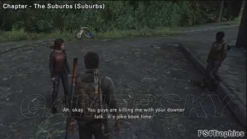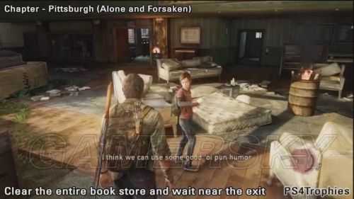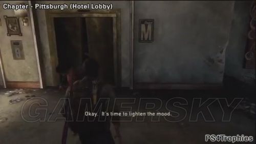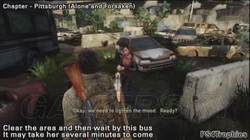 在来到匹兹堡后,会碰见一个类似汽车坟场的地方。远处是一个倾斜的巴士,从上面跳下来3个敌人,把他们解决后你就在公车旁边等着吧。过一会儿或者几分钟,艾莉就会过来要调节一下气氛,拿出珍藏的笑话书讲出一堆冷笑话。