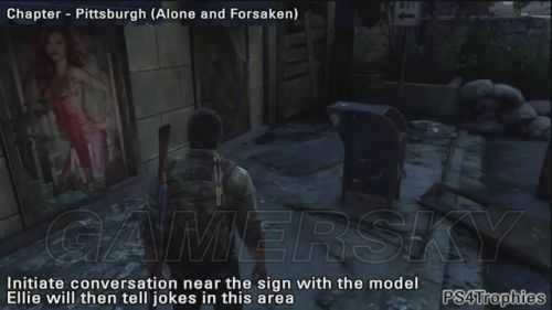 在进入匹兹堡后一直到下水道那里,总共有5次可以触发玩世不恭的艾莉讲出冷笑话,总的来说就是天热大家冷一下+一个隐藏金杯。以下为触发地点和触发条件。