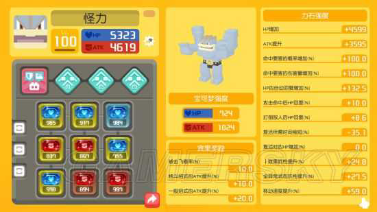 首先在选择石头上,我们要把【攻击命中后HP%回复】叠到10(10理论上应该是最高,但是我的大岩蛇有10.7也不知道是怎么回事),无论是我们的输出宝可梦还是两个辅助宝可梦都应把这一项叠满。