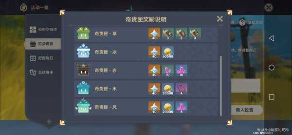《原神》新活动百货奇货中玩家们每天可以获取一个宝箱,7个宝箱奖励各不相同,玩家可以去别人的主世界领取对应的奖励,下面请看“响亮的昵称”分享的《原神》百货奇货奖励性价比分析,希望能够帮助大家。