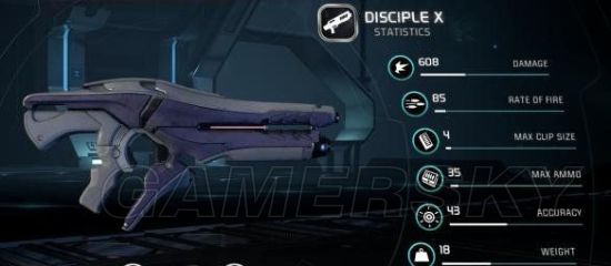 下图就是散弹枪DISCIPLE,比N7 PIRANHA的输出DPS要低一些,但是不用加离子追踪模块(我通关时也只捡到一个离子追踪模块),而且,这个DISCIPLE只有2个装模块的眼儿——加-5%血加满弹夹的模块和+1MOD模块就满了,而这2个模块就必须加的。DISCIPLE也安装和上面的N7 PIRANHA一样的3个MOD:加穿透伤害、枪管和弹夹。