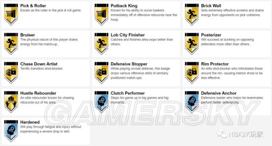 标配的十枚金徽章以内线攻防为主,隔扣达人、空接终结者、护框精英、精英篮板手、补篮之王等均在列。