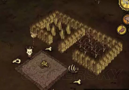 通常出现在平原地形。一圈木墙里面会有一些散落的牛毛和骨头;在入口出会有一个箱子,里面有1个火焰法杖、4个炸药和4个木头。当玩家打开或者用锥子砸箱子时会着火,火焰引燃炸药,使得周围的木墙都被点燃,很容易被烧死。正确的方法是先用锤子砸掉箱子周围的木墙,然后再打开箱子获取物品。PS:火杖不会被烧毁,可以等火灭了再去捡。