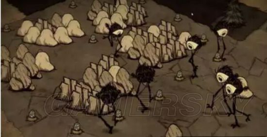 偶尔在矿区可以发现大量的石矿和金矿聚集在一起,周围有很多高鸟巢,是一个十分危险的地方!如果离基地不是很远,可以利用高鸟们帮助打猎狗群和一些boss。