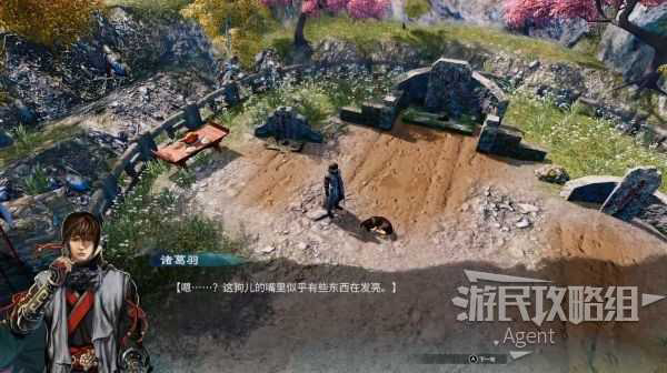 墓旁供桌上有祭品,对桌子运劲得到狗子最爱的糖糟。正好一旁狗子嘴里有东西发亮,喂他糖糟获得自明珠。