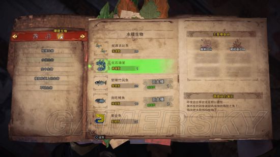 在猎人笔记中可查看捕获的环境生物,稀有环境生物的图标边框和普通环境生物的图标边框有很大区别。普通水栖生物的巨大种捕获后会在该种水栖生物的的笔记中追加巨大种标记。