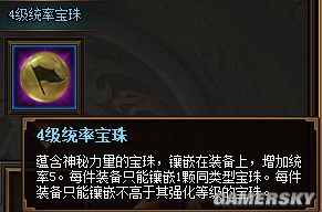 蕴含神秘力量的宝珠,镶嵌在装备上,增加统率5。每件装备只能镶嵌1颗同类型宝珠。每件装备只能镶嵌不高于其强化等级的宝珠。