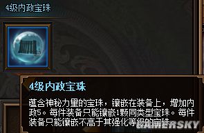 蕴含神秘力量的宝珠,镶嵌在装备上,增加内政5。每件装备只能镶嵌1颗同类型宝珠。每件装备只能镶嵌不高于其强化等级的宝珠。