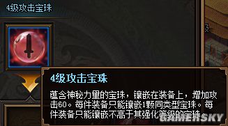 蕴含神秘力量的宝珠,镶嵌在装备上,增加攻击60。每件装备只能镶嵌1颗同类型宝珠。每件装备只能镶嵌不高于其强化等级的宝珠。