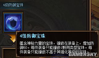 蕴含神秘力量的宝珠,镶嵌在装备上,增加防御60。每件装备只能镶嵌1颗同类型宝珠。每件装备只能镶嵌不高于其强化等级的宝珠。