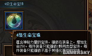 蕴含神秘力量的宝珠,镶嵌在装备上,增加生命250。每件装备只能镶嵌1颗同类型宝珠。每件装备只能镶嵌不高于其强化等级的宝珠。