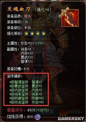 下面是小编在《热血三国3》强化4级的30级橙装“灭魂血刀”上,镶嵌满4级宝珠的属性图(除生命宝珠)。