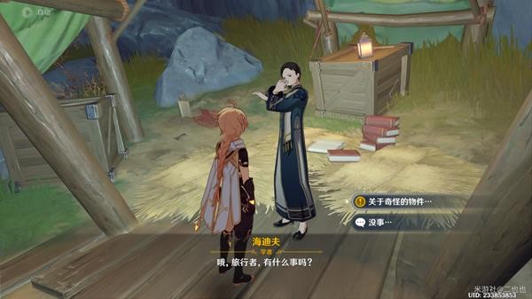 传送回营地锚点,与海迪夫对话,关于奇怪的物件。
