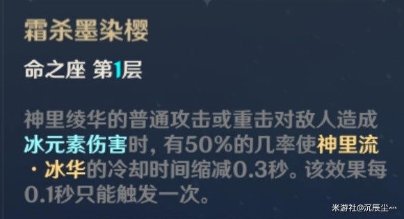 描述: 神里绫华的普通攻击或重击对敌人造成冰元素伤害时,有50%的几率使神里流•冰华的冷却时间缩减0.3秒。该效果每0.1秒只能触发一次。