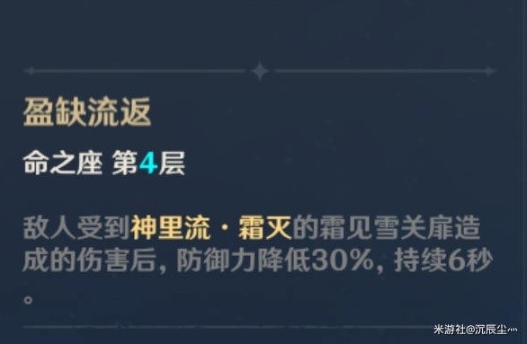 描述: 敌人受到神里流•霜灭的霜见雪关扉造成的伤害后,防御力降低30%,持*6*。
