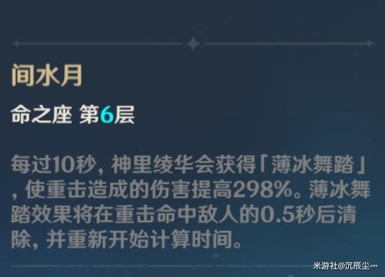 描述: 每过10秒,神里绫华会获得「薄冰舞踏」,使重击造成的伤害提高298%。薄冰舞踏效果将在重击命中敌人的0.5秒后清除,并重新开始计算时间。