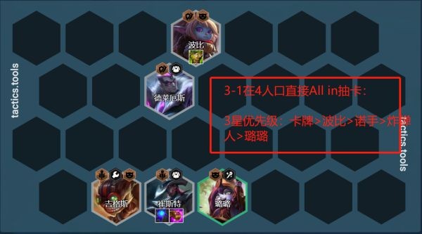 2.前期不拉人口连败过渡,3人口只上3约德尔去嫖波比、炸弹人、璐璐这三张卡牌。2-3自动拉4人口补充卡牌或者诺手,如果波比1星,那么直接上诺手支撑一下前排的坦度,反之则上卡牌补充伤害;