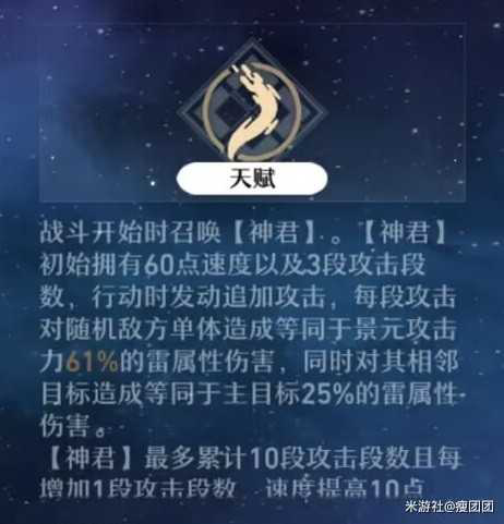 神君:雷属性「智识」大C,进入战斗后,神君会召唤挂件景元,神君-初始攻击段数为3段,速度60,景元的战技、秘技和终结技都可以增加-神君-的攻击段数,段数每增加一段,神君速度会提升10点,神君的攻击附带25%扩散效果。